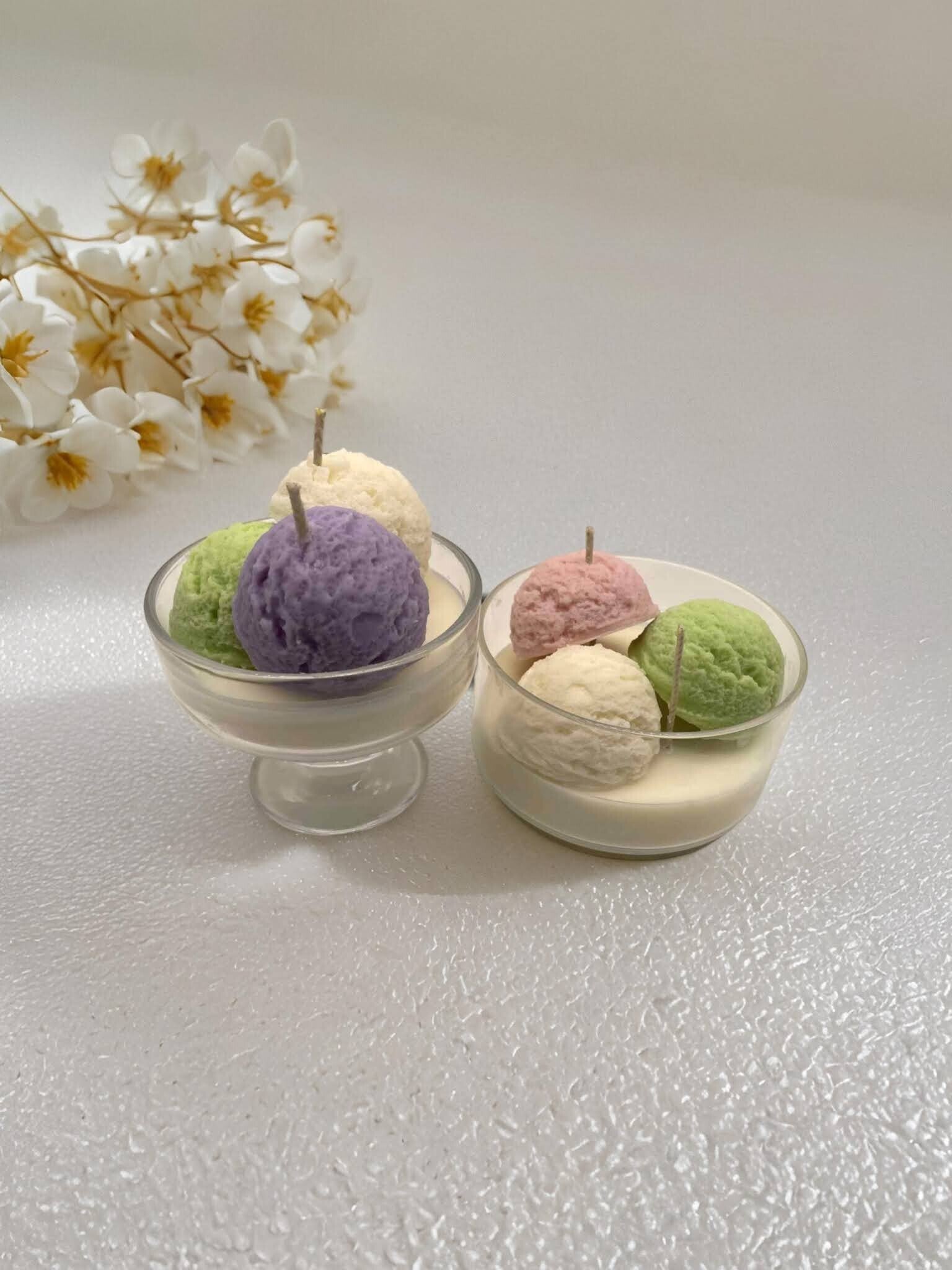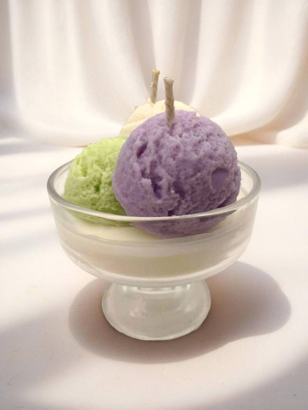 Designed to resemble a delicious cup of ice cream, this candle features a realistic, whipped texture with decorative details that mimic scoops and swirls.
