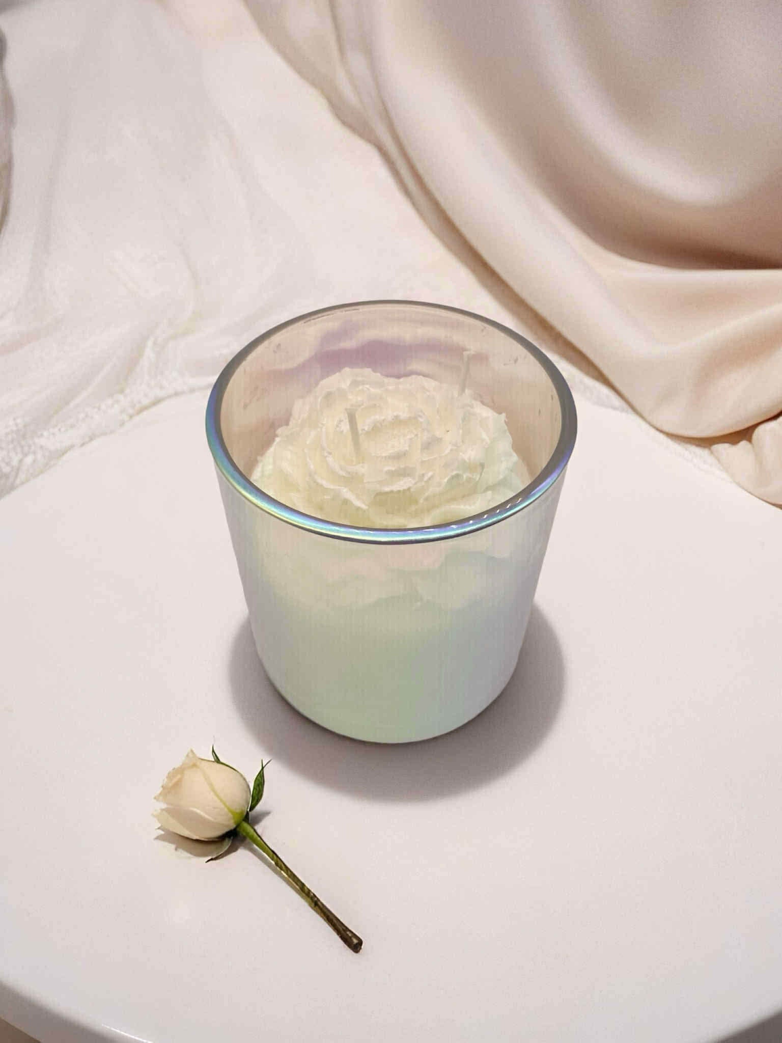 These candles are housed in stunning iridescent glass containers that shimmer with soft, rainbow-like reflections as they catch the light.